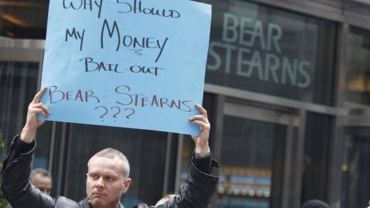 En marzo de 2008 el banco de inversión Bear Stearns cayó en quiebra. Sus niveles de apalancamiento y exposición en vehículos de alto rendimiento (que no eran otra cosa que créditos hipotecarios incobrables) lo habían llevado a la bancarrota. La Reserva Federal (Fed) presionó a JP Morgan y le prestó 30 mil millones de dólares (mmdd) para que adquiriera Bear Stearns pagando dos dólares por acción (cuando se habían cotizado en 133 un año antes). El objetivo era evitar la quiebra de otros bancos de inversión, como Merryll Lynch y Lehman Brothers, que también estaban fuertemente comprometidos.