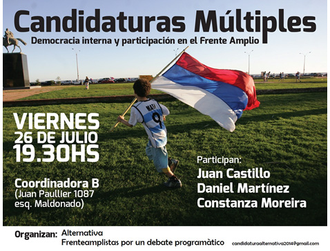 Como puntapié inicial de cara a las elecciones de 2014, Alternativa y Frenteamplistas por un debate programático invitan a todos y todas quienes se sientan parte de la gran construcción colectiva que es el FA, a conocer la opinión de tres referentes de primera línea del partido y a debatir con ellos sobre la coyuntura electoral y los caminos abiertos para la participación democrática.