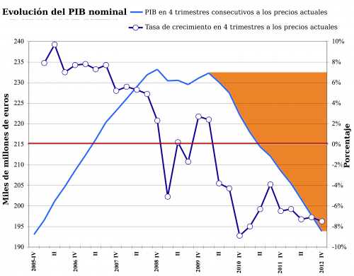 Una parte de este movimiento se explica muy bien por la degradación continua de la actividad económica del país. La producción (en el sentido del PIB de los precios corrientes, pues esto es lo que sirve de base para la fiscalidad) fue durante el tercer trimestre de 2012 sólo de 51.700 millones de euros contra los 55.700 millones de euros durante el mismo periodo de 2011, es decir que se observa un descenso del 7,1%. Los resultados del cuarto trimestre, que acaban de ser publicados, son aún peores. La producción ha caído a 47.200 millones de euros, o sea hay un descenso del 7.3% en comparación con las cifras del mismo periodo de 2011.