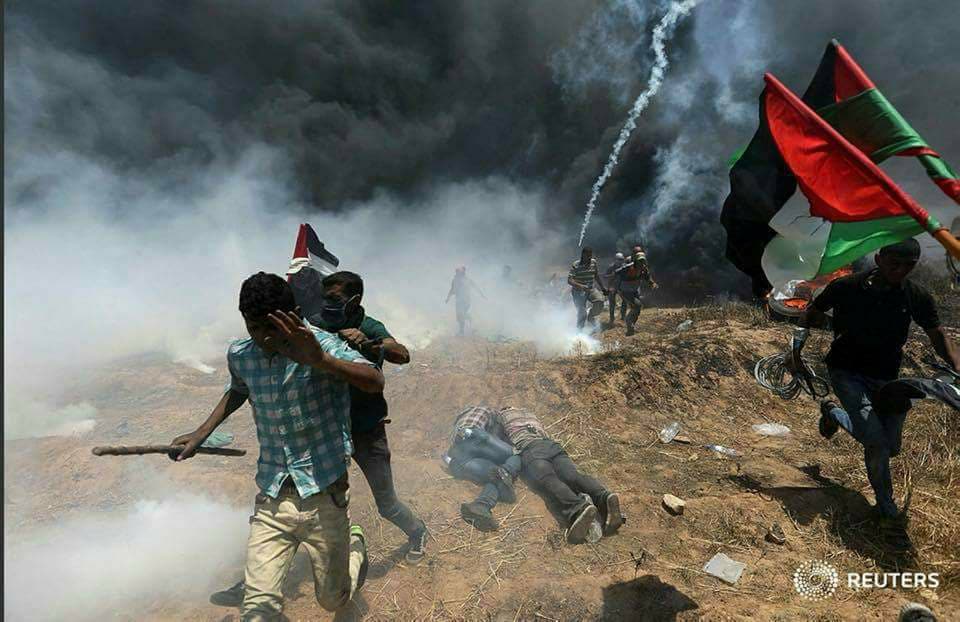 *** Decenas de miles de palestinos se manifiestan al lado de las alambradas que encierran a la Franja de Gaza, un verdadero gueto de casi 2 millones de habitantes. Mayoritariamente en forma pacifica, algunos de manera violenta pero sin crear un peligro real para los israelies del otro lado de los alambrados, Los palestinos de Gaza, en su mayoria descendientes de refugiados desplazados de los territorios donde fue fundado Israel en 1948, recuerdan su condicion de refugiados, claman por su derecho al retorno y contra el bloqueo de Gaza por parte de Israel. Es el dia vispera del aniversario de la proclamacion del Estado de Israel, creado sobre las tierras de las cuales fueron despojados. Francotiradores israelies matan a 53 manifestantes. Cientos de heridos, la mitad de bala, otros seriamente afectados por gases y balines de goma.