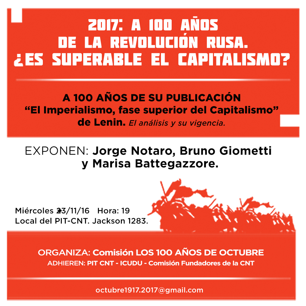A cien años de Octubre ¿Es superable el capitalismo? Detalles Eventos 17 Noviembre 2016 2430 share with Telegram share with Whatsapp powered by social2s miércoles, 23 de noviembre de 19:00 a 22:00 Sede PIT-CNT - JACKSON 1283 Anterior Siguiente share with Telegram share with Whatsapp powered by social2s